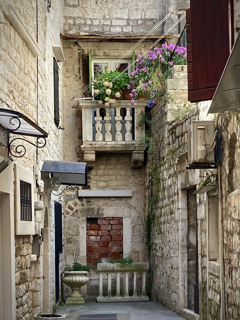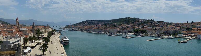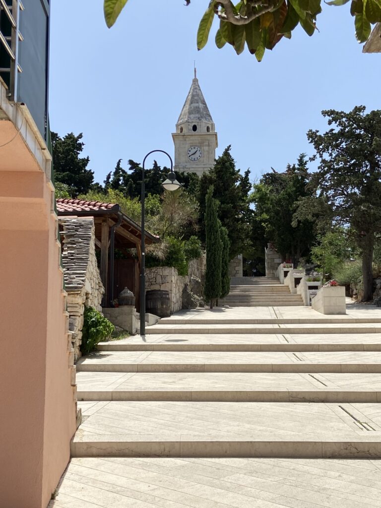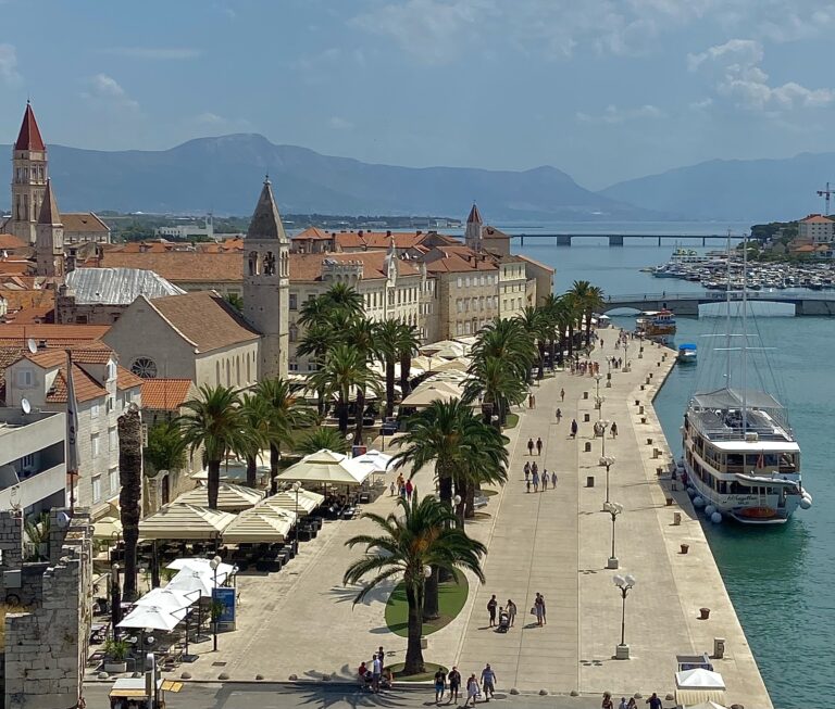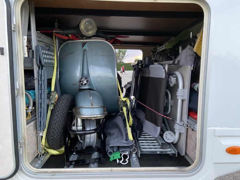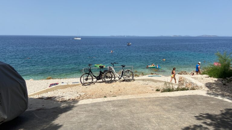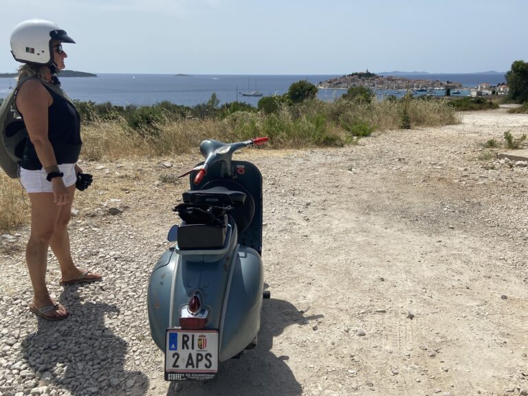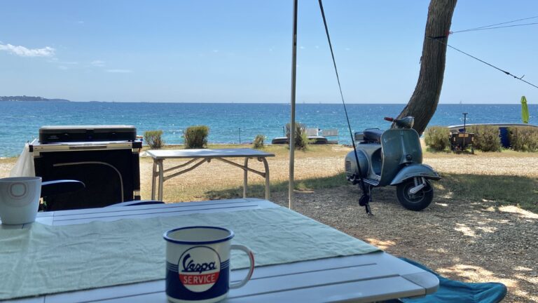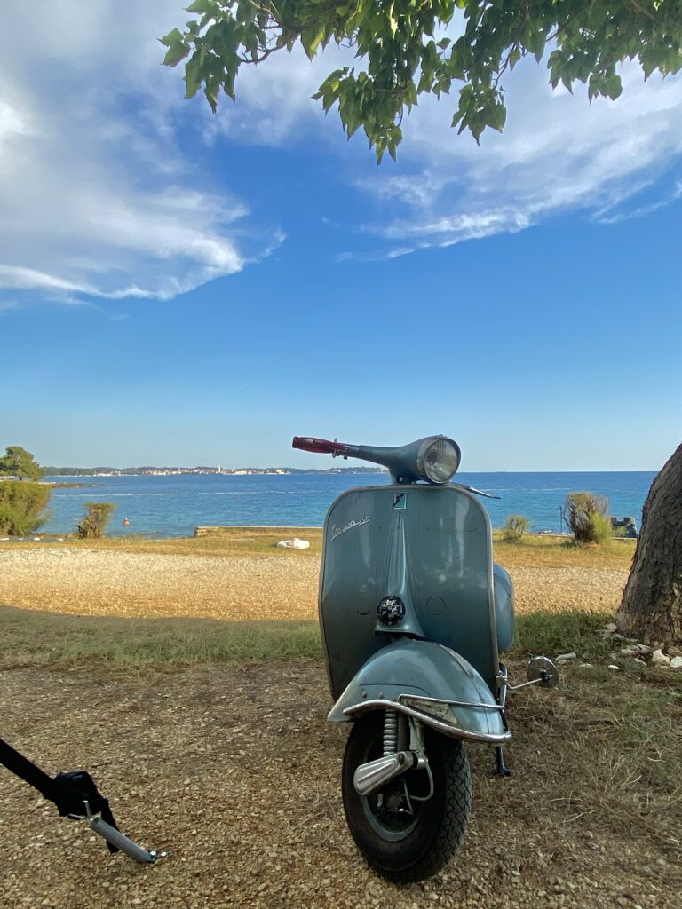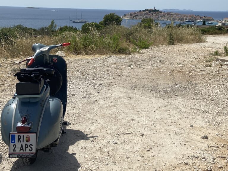 Und so ging es quer über Istrien weiter nach Rijeka und die Küstenstraße runter nach Zadar, wo wir unseren nächsten Zwischenstop für eine Stadtbesichtigung einlegten. Zwei Tage später fuhren wir weiter Richtung Süden nach Primosten. Von dort aus machten wir einen Tagesausflug mit unserer alten Vespa nach Trogir mit seiner wunderschönen Promenade und Altstadt. Wir hatten dann noch geplant, nach Makarska weiterzufahren und von dort aus mit dem Boot nach Brac überzusetzen, um uns das goldene Horn anzusehen. Da der Campingplatz dort aber „suboptimal“ war, sind wir noch in Richtung Norden aufgebrochen und hatten uns als letztes Ziel Porec ausgesucht. Dort kamen wir dann nach einer langen Fahrt um 21 Uhr abends an und sicherten uns einen traumhaften Stellplatz unmittelbar am Meer.