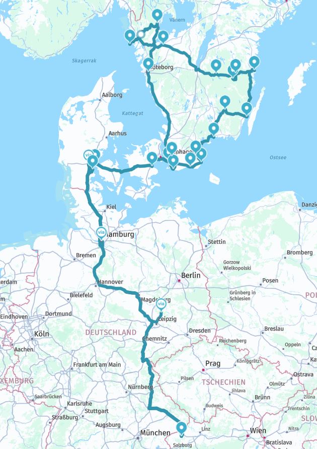 … aus der Einladung eines Freundes zu seiner Geburtstagsparty in Göteborg wird nun unser erster Großtrip im Jahr 2024: Wir werden uns am Landweg über Deutschland nach Dänemark unserem Ziel Südschweden nähern und überqueren dabei die Storebælt- und die gewaltige Øresundsbron, die Kopenhagen und Malmö verbindet.