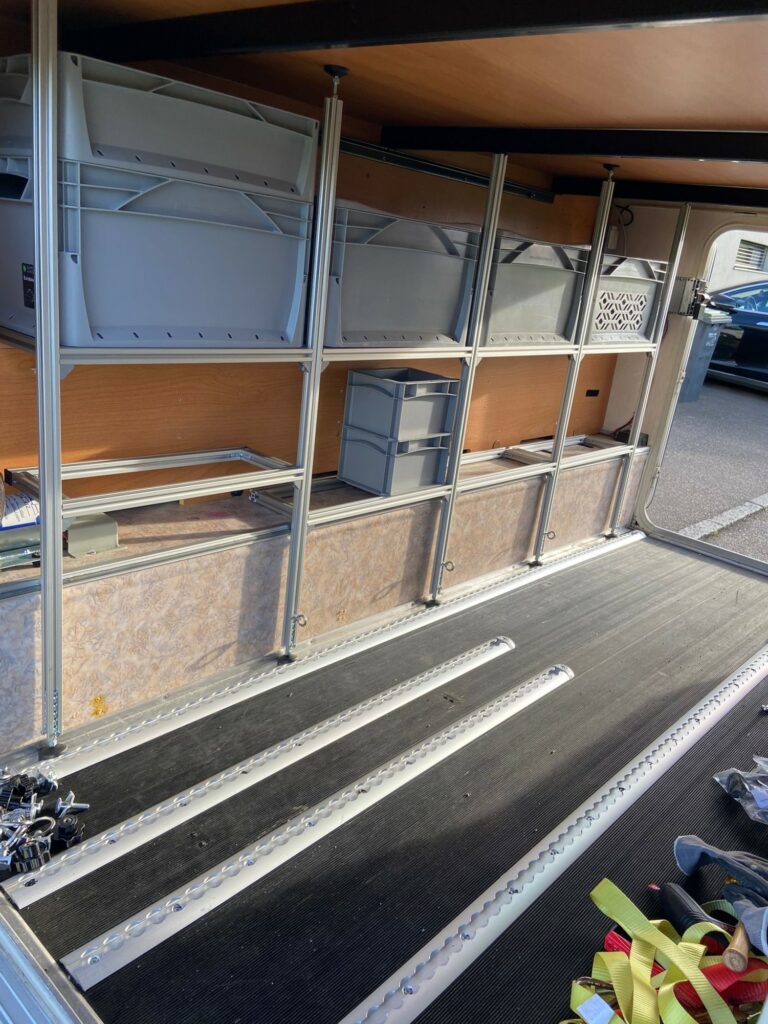 – Konzeption und Einbau eines passgenauen „Ordnungssystems“ in der Heckgarage für Euroboxen
